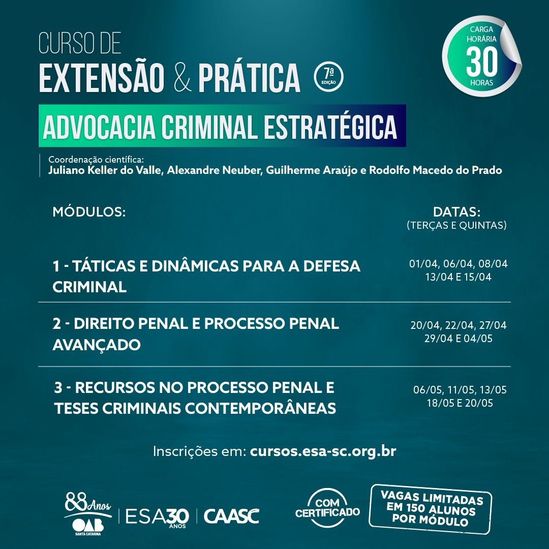 Módulos: Táticas e Dinâmicas para a Defesa Criminal; Direito Penal e Processo Penal Avançado; Recursos no Processo Penal e Teses Criminais Contemporâneas