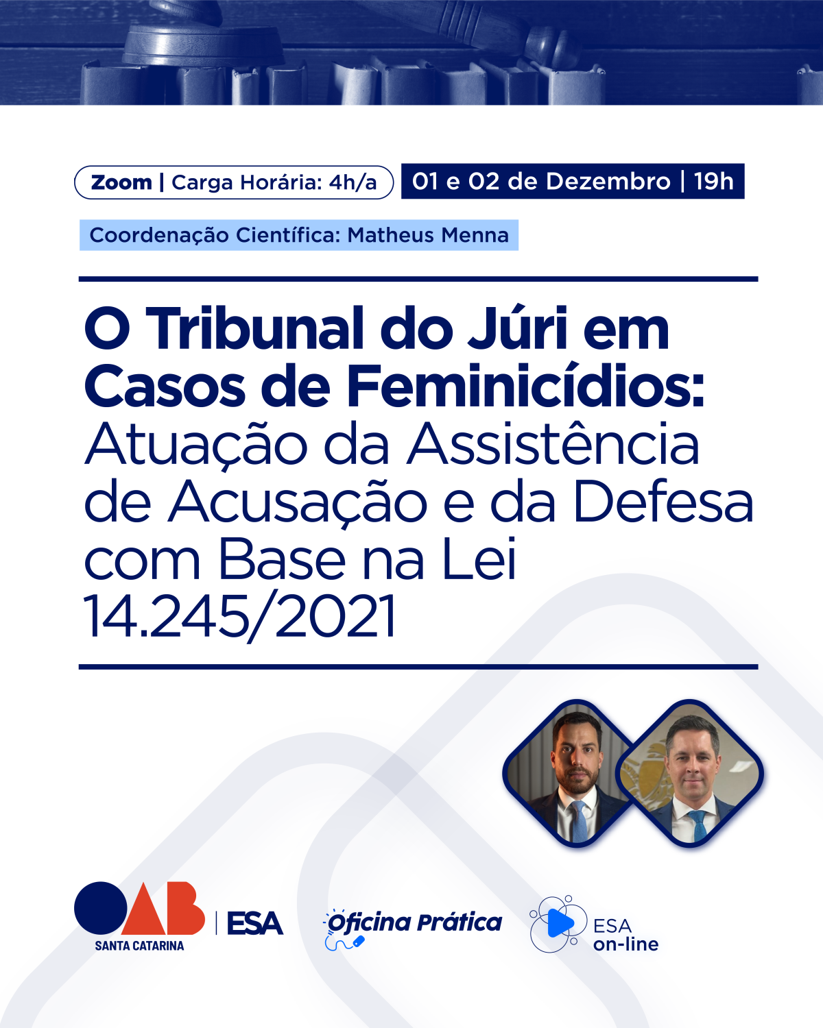 - O certificado estará disponível no site da OAB/SC a partir de 15 dias úteis após o término do curso.