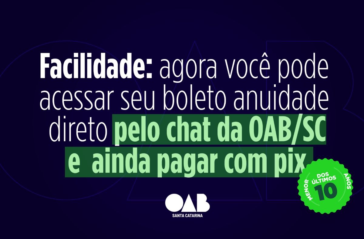 A Ordem dos Advogados do Brasil em Santa Catarina (OAB/SC) disponibilizou uma nova funcionalidade que torna ainda mais simples o acesso aos boletos de pagamento da anuidade. Agora, basta inserir o número do CPF no chat para que o sistema identifique automaticamente os débitos em aberto e gere o boleto correspondente, inclusive da anuidade de 2026, que já está disponível para pagamento. Não é necessário login adicional nem acesso a outros sistemas: o processo é direto e totalmente digital.