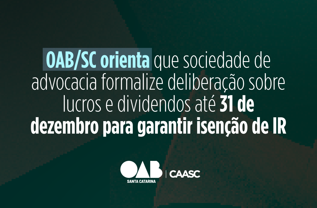 As Comissões de Sociedades de Advogados e de Direito Tributário da OAB Santa Catarina orientam que as sociedades de advogados catarinenses aprovem e protocolem, até 31 de dezembro, a deliberação sobre a distribuição de lucros e dividendos referentes ao exercício de 2025, com a finalidade de garantir a isenção do Imposto de Renda sobre esses valores, conforme previsto na Lei nº 15.270/2025.