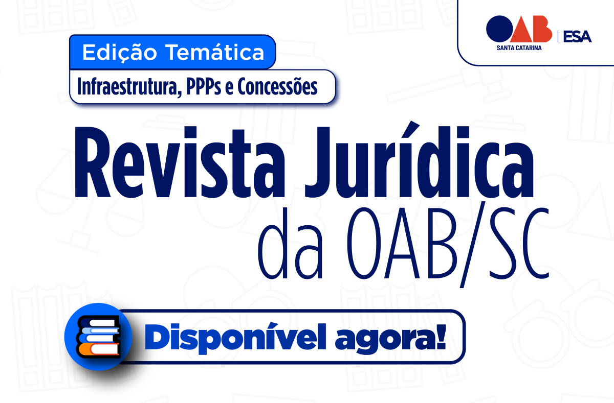 A primeira edição temática da Revista Jurídica da OAB/SC, dedicada ao tema Infraestrutura, PPPs e Concessões, já está disponível para leitura. A publicação reúne artigos que exploram os principais desafios, tendências e soluções jurídicas voltadas ao desenvolvimento estratégico de Santa Catarina e do Brasil.