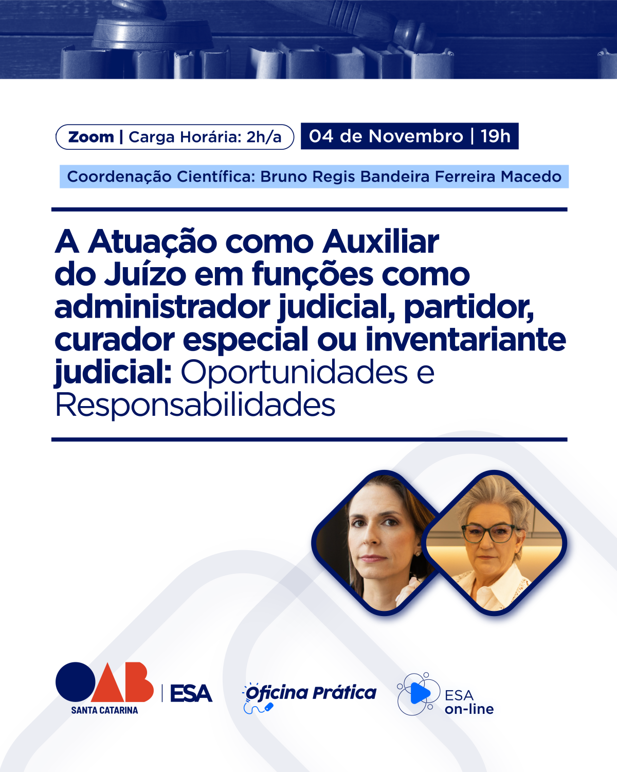 - O certificado estará disponível no site da OAB/SC a partir de 15 dias úteis após o término do curso.