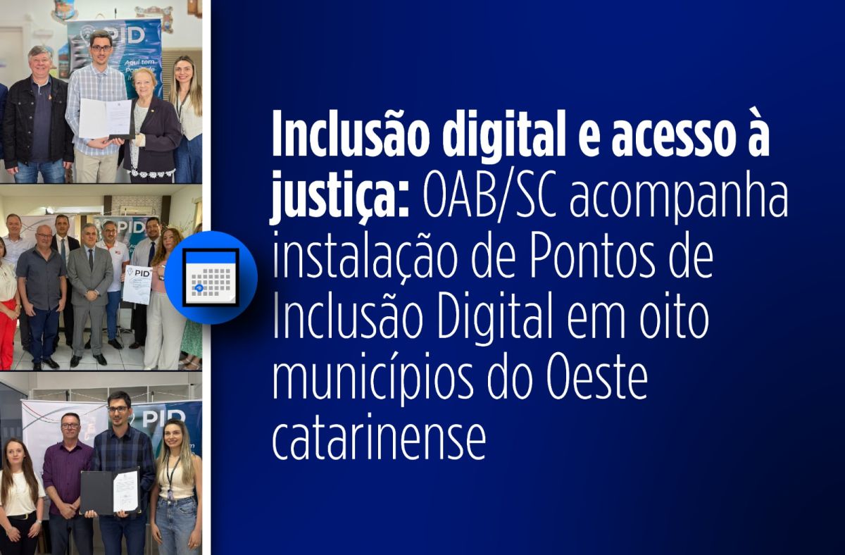 A OAB Santa Catarina acompanhou, nesta semana, a instalação de novos Pontos de Inclusão Digital (PIDs), programa do Tribunal de Justiça de Santa Catarina, em oito municípios do Estado, em uma iniciativa que reforça o compromisso da Ordem com a ampliação ao acesso à Justiça, à cidadania e aos serviços públicos digitais. As ações, conduzidas pelo TJSC, contaram com a participação de representantes da Seccional nas solenidades de inauguração.