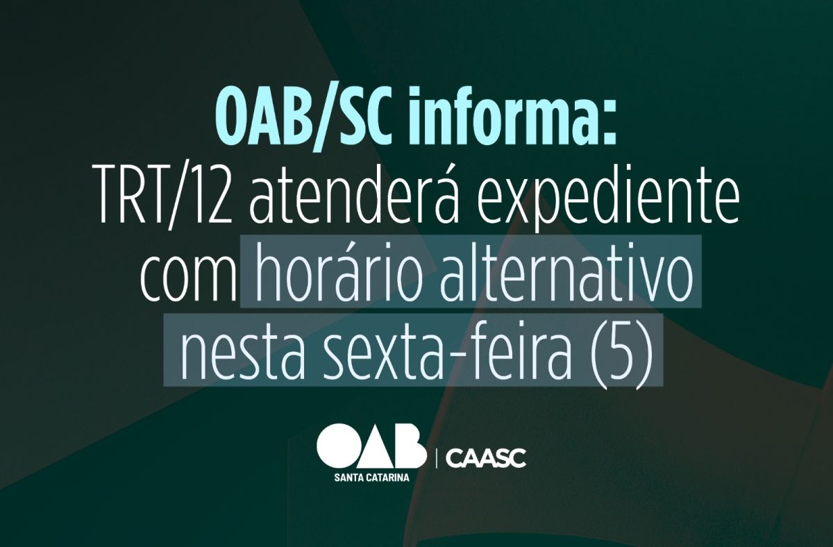 A OAB Santa Catarina informa que nesta sexta-feira (5), que o Foro da Capital, do Tribunal Regional do Trabalho da 12ª Região, localizado na Av. Jornalista Rubéns de Arruda Ramos, 1588, no Centro de Florianópolis, estabelece o horário de expediente das 10h às 16h.