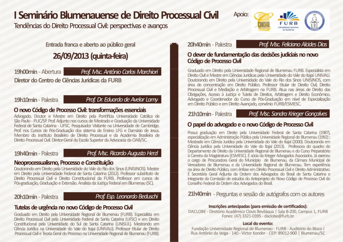 Também participará do evento o diretor geral da Escola Superior de Advocacia da OAB/SC, Eduardo Lamy, que dará a palestra “O novo Código de Processo Civil: transformações essenciais”. A programação do Seminário será aberta pelo professor Antônio Carlos Marchiori, diretor do Centro de Ciências Jurídicas da FURB. O professor Ricardo Augusto Herzl abordará o tema “Neoprocessualismo, Processo e Constituição”; Leonardo Beduschi, “Tutelas de urgência no novo Código de Processo Civil”; e Feliciano Alcides Dias, “O dever de fundamentação das decisões judiciais no novo Código de Processo Civil”.